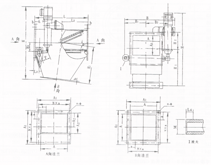 电液动两路换向阀的充气阀板采用柔性厚型板式合成纤维织物,是一种新型透气层、具有耐高温(可达150℃),耐腐蚀、耐磨损、吸湿性低、重量轻、表面轻、表面平正、使用寿命长等优点,出料口与空气输送管路之间的倾角分为(图示a°4°、6°、8°、10°、和12°)五种。电液动两路换向机构采用电液推杆作动力源。
