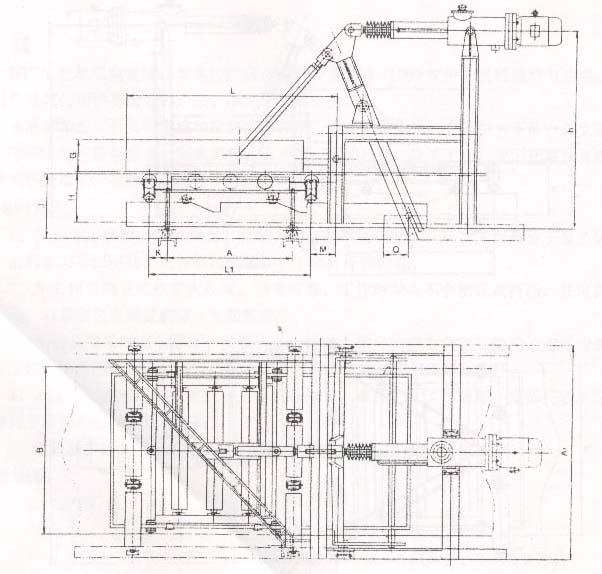 电液动犁式卸料器以电液动推杆为动力源,带动框架前进,完成犁头下落,并支承平托辊,犁刀下缘与胶带贴合,完成卸料。完华后,框架后退,犁头上抬,变形托辊恢复槽形,胶带则则恢复槽形,物料平稳通过。