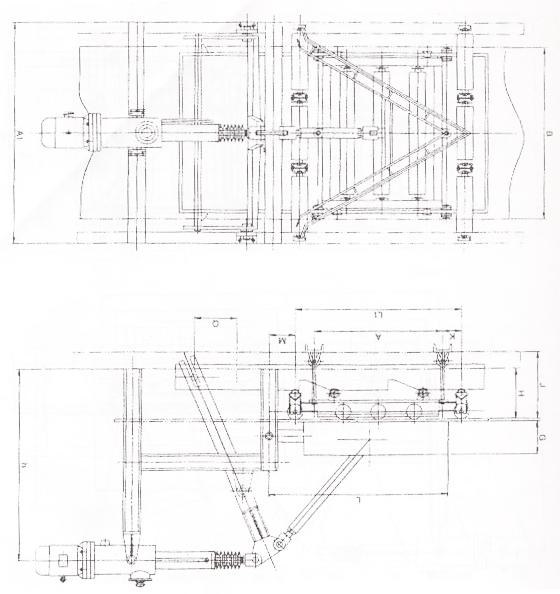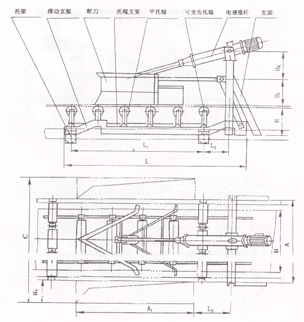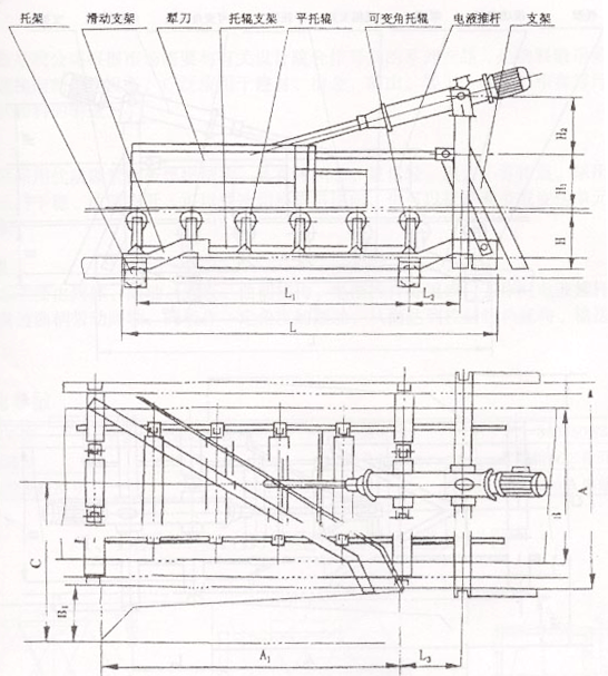 电液动犁式卸料器以电液动推杆为动力源,带动框架前进,完成犁头下落,并支承平托辊,犁刀下缘与胶带贴合,完成卸料。完华后,框架后退,犁头上抬,变形托辊恢复槽形,胶带则则恢复槽形,物料平稳通过。